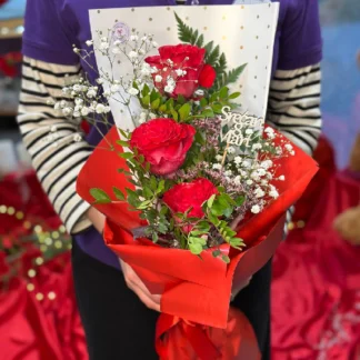 Buket svežih crvenih ruža ukrašen gipsofilom