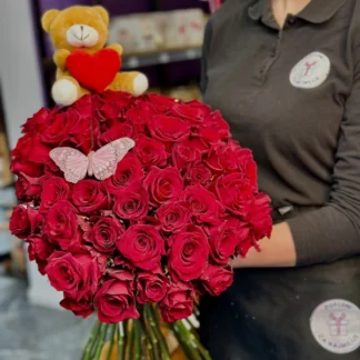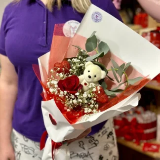 Buket Love sa igračkom je spoj elegancije i topline, idealan za izražavanje osećanja na poseban način. Sastavljen je od crvene ruže, delikatne gipsofile i listova eukaliptusa koji dodaju svežinu i teksturu. U centru pažnje nalazi se igračka, koja daje posebnu notu nežnosti buketu. Ukrasna srca i pažljivo odabrani ukrasni papir dodatno ističu lepotu i sofisticiranost ovog aranžmana.