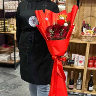 Buket sa crvenim ružama i plišanim medom u crvenom papiru je elegantan izbor za izražavanje ljubavi i pažnje. Kombinuje lepotu crvenih ruža, simbola ljubavi i strasti, sa slatkim dodatkom igračke. Savršen je poklon za posebne prilike poput godišnjica, rođendana ili proslava ljubavi.