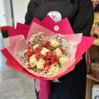 Ono što ovaj buket čini posebnim jeste pažljivo odabrana kombinacija boja i tekstura: crvene ruže sa svojom intenzivnom bojom i delikatnim mirisom upotpunjuju toplinu crvenog papira koji obavija buket. Dodatak plišanog mede donosi dodatnu emotivnu vrednost i čini poklon ne samo vizuelno privlačnim već i simboličkim izrazom nežnosti i brige. Ovakvim gestom ćete sigurno izmamiti osmeh na licu voljene osobe.