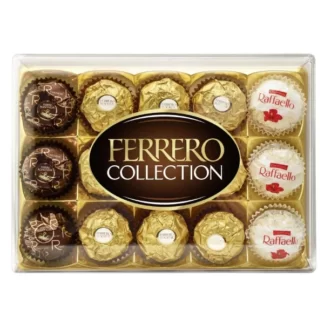 Ferrero Collection uključuje neodoljive slatkiše kao što su Ferrero Rondnoir, Ferrero Rocher i Raffaello. Pruža vam ukusnu kombinaciju tekstura, od hrskavog vafla do bogatog kakao fila i tamnog čokoladnog srca, do celog lešnika obavijenog kremastim filom, glatkom mlečnom čokoladom i sitno seckanih komadića lešnika. Ovaj proizvod je savršen izbor za poklon ili kao posebna poslastica za uživanje u trenucima kada želite da se prepustite vrhunskom ukusu i luksuzu.