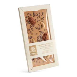 Ono što Bark Gold belu čokoladu čini posebnom nije samo njen izvanredan ukus, već i pažljivo birani sastojci i dizajn pakovanja. Kombinacija karamele i dva tipa oraha dodaje složenost ukusu i teksturi, dok kakao zrno pruža blagu gorčinu koja savršeno balansira slatkoću. Elegantno providno pakovanje ističe kvalitet i lepotu proizvoda, čineći da čokolada ugodi nepcu i vizuelno impresionira.
