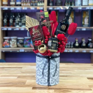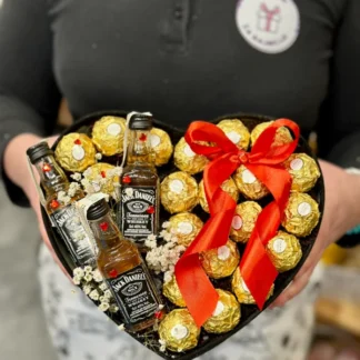 Slatko srce u kutiji sa viskijem je savršen je izbor da na originalan i stilski način izrazite svoja osećanja. Elegantna kutija u obliku srca ispunjena je Ferrero Rocher kuglicama, tri mini bočicama Jack Daniels viskija, sitnim cvećem i ukrašena prefinjenom crvenom mašnom. Ova kombinacija slatkiša i viskija simbolizuje harmoniju između sofisticiranosti i slatke strasti, čineći ga idealnim izborom za važne prilike poput godišnjica.
