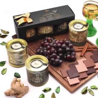 Vojvodina gift box suvenirsko pakovanje od 360g sadrži tri različite vrste čokolade, svaka sa svojim jedinstvenim karakterom. Prva je mlečna čokolada sa 35% kakao delova, obogaćena ukusom lešnika i spekulas kolačića. Druga je crna čokolada sa 61% kakao delova, koja će vas očarati osvežavajućim ukusom đumbira i limuna. I na kraju, bela čokolada sa 32% kakao delova i bogatim ukusom maline. Ovi ukusi su pažljivo odabrani kako bi vam pružili jedinstveno iskustvo i omogućili da osetite dušu Vojvodine u svakom zalogaju.